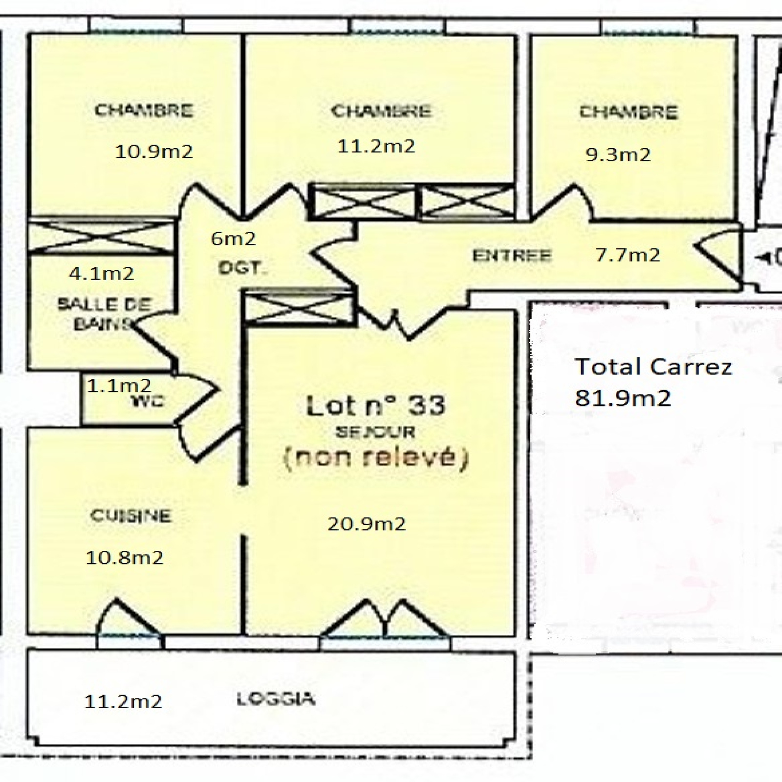 L'appartement est composé d'une pièce à vivre avec cuisine attenante qui peuvent ètre relié très facilement et former une pièce de vie de 32m2 ouverte sur une terrasse de 11.2m2, de 3 chambres, une salle de bains et un WC indépendant.