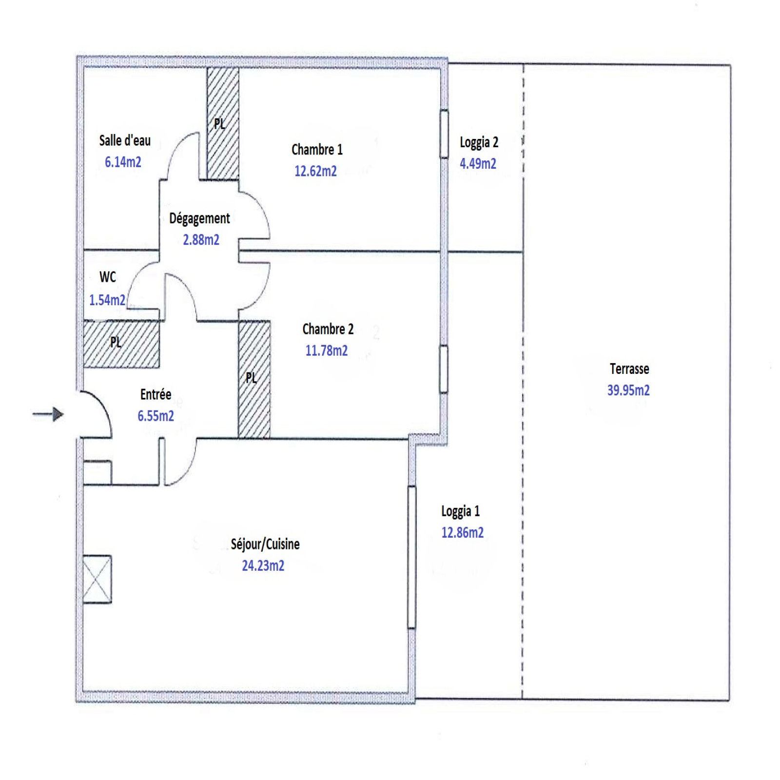 L'appartement est composé, d'une entrée, d'une belle pièce de vie avec une cuisine entièrement équipée et un séjour ouvert sur un bel extérieur Terrasse/Loggias, de deux grandes chambres, d'une spacieuse salle d'eau et d'un WC indépendant.