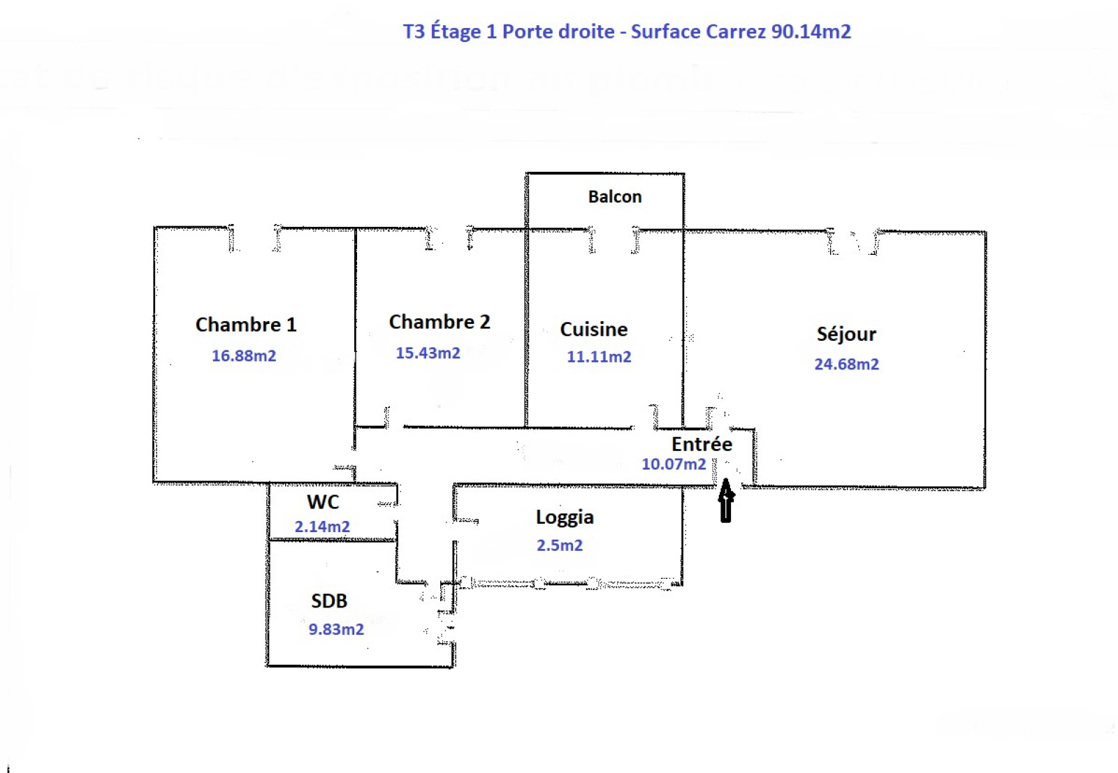 1er étage: T3 46m2 - loué 372 Euros HC