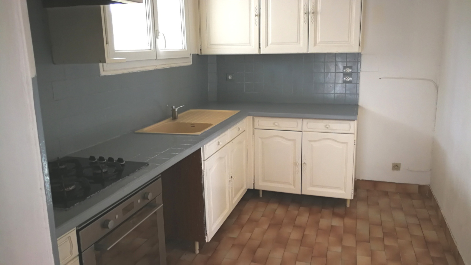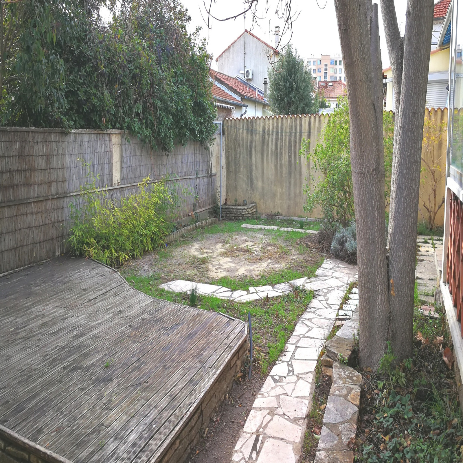 De plain pied maison de ville des années 50 mitoyenne d'un côté, d'environ 80 m² habitables, séjour, cuisine, trois chambres, salle d'eau, wc.