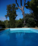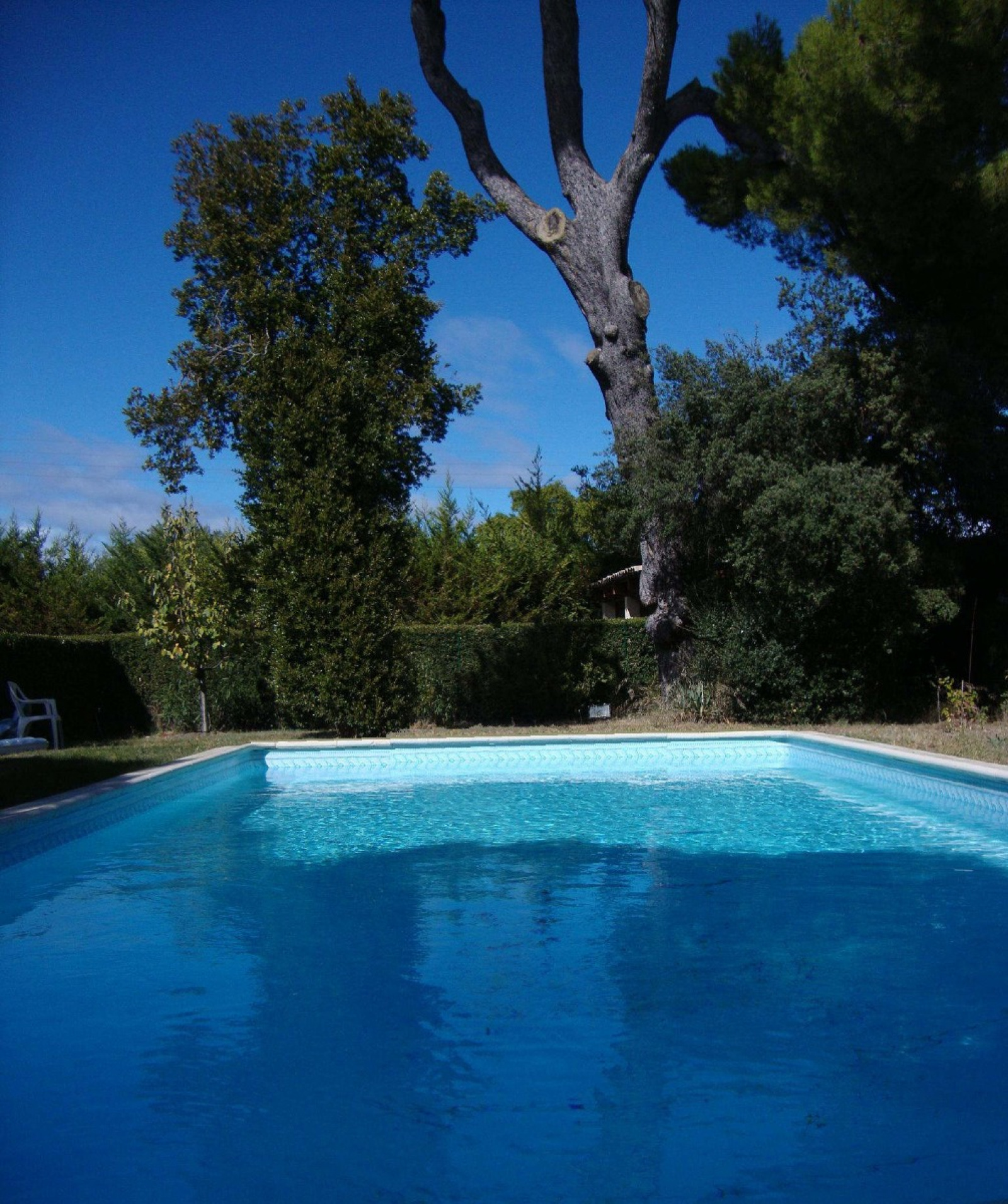 La piscine 9 x 5 est clôturée et entourée de buis anciens.