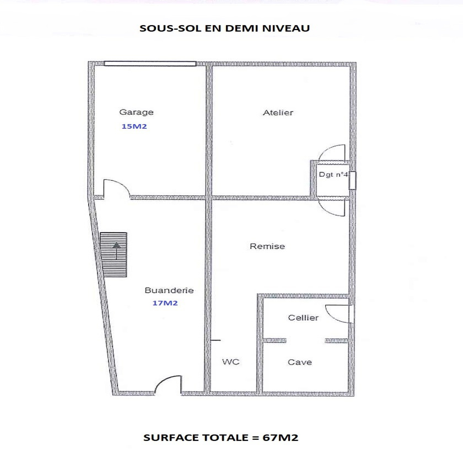 Elle bénéficie également d'une partie utilisable en demi sous-sol de 35m2 avec hauteur de plafond 1.9m, d'un espace buanderie-rangement de 17m2 et d'un garage de 15m2.