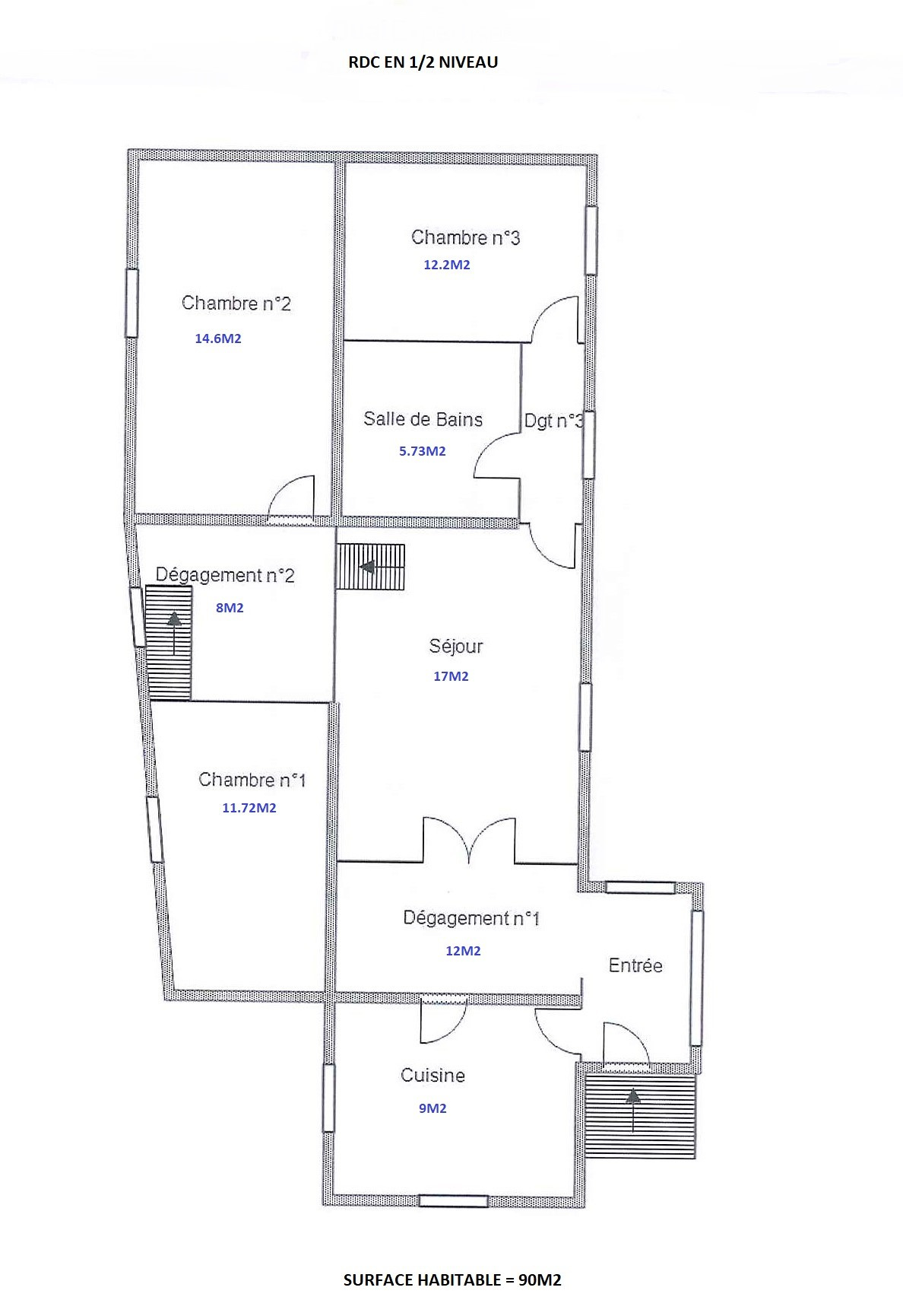 La maison d'une surface habitable de 90m2 est composé: au RDC surélevé: D'un salon, d'une cuisine indépendante, de 3 chambres et d'une salle de bains avec WC,