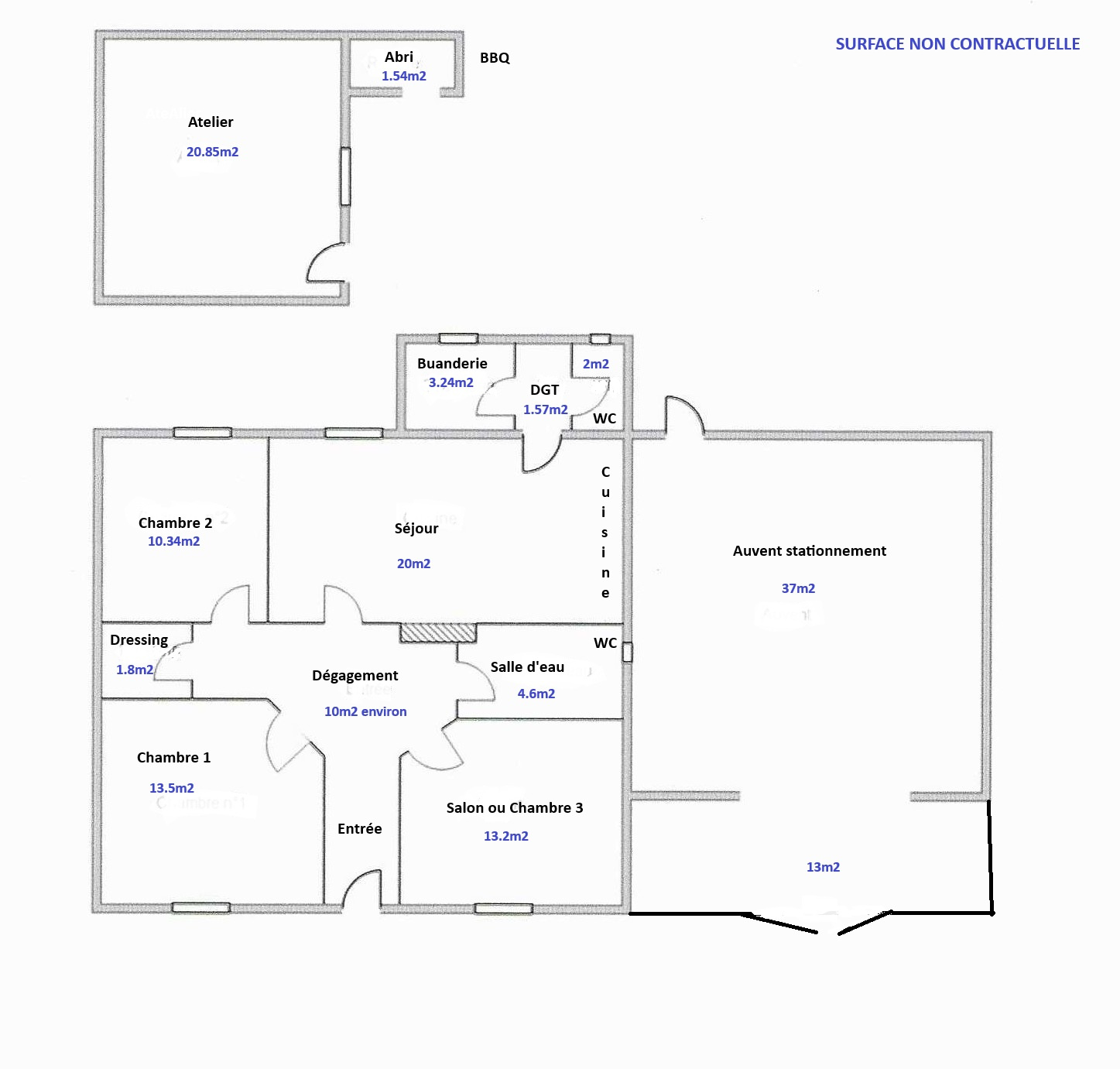 La maison d'environ 80m2 habitable, consruite années 1950 sur une parcelle de 290m2 de terrain est composeé: D'une entrée, d'une pièce de vie cuisine/séjour, de 3 grandes chambres, d'un dressing, d'une salle d'eau, d'une buanderie, de 2 WC...