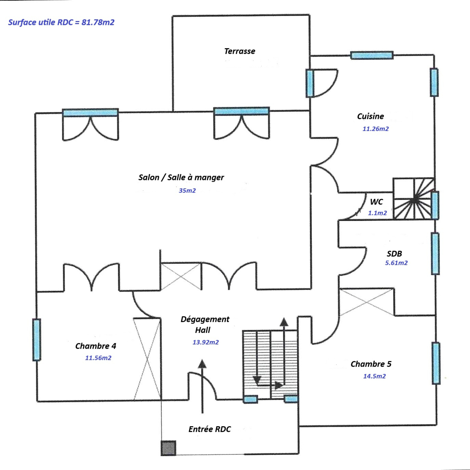Au Rez-de-chaussée: Une cuisine séparée, un spacieux salon séjour, 2 chambres, une salle de bains et un WC indépendant.
