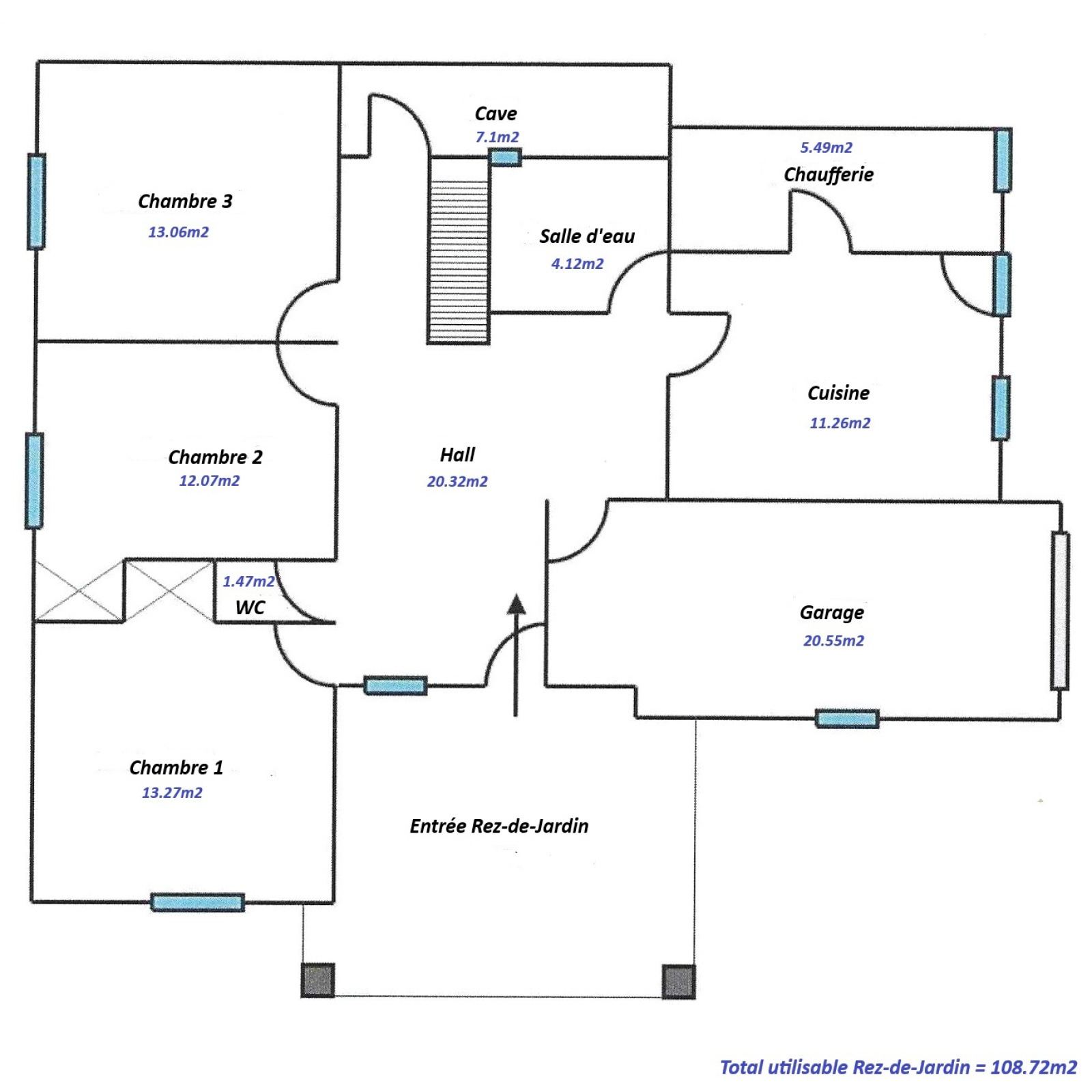 La maison est composée: au Rez-de-jardin: De 3 chambres, une salle de bains, un WC, une cuisine avec chaufferie attenante, et un grand garage.